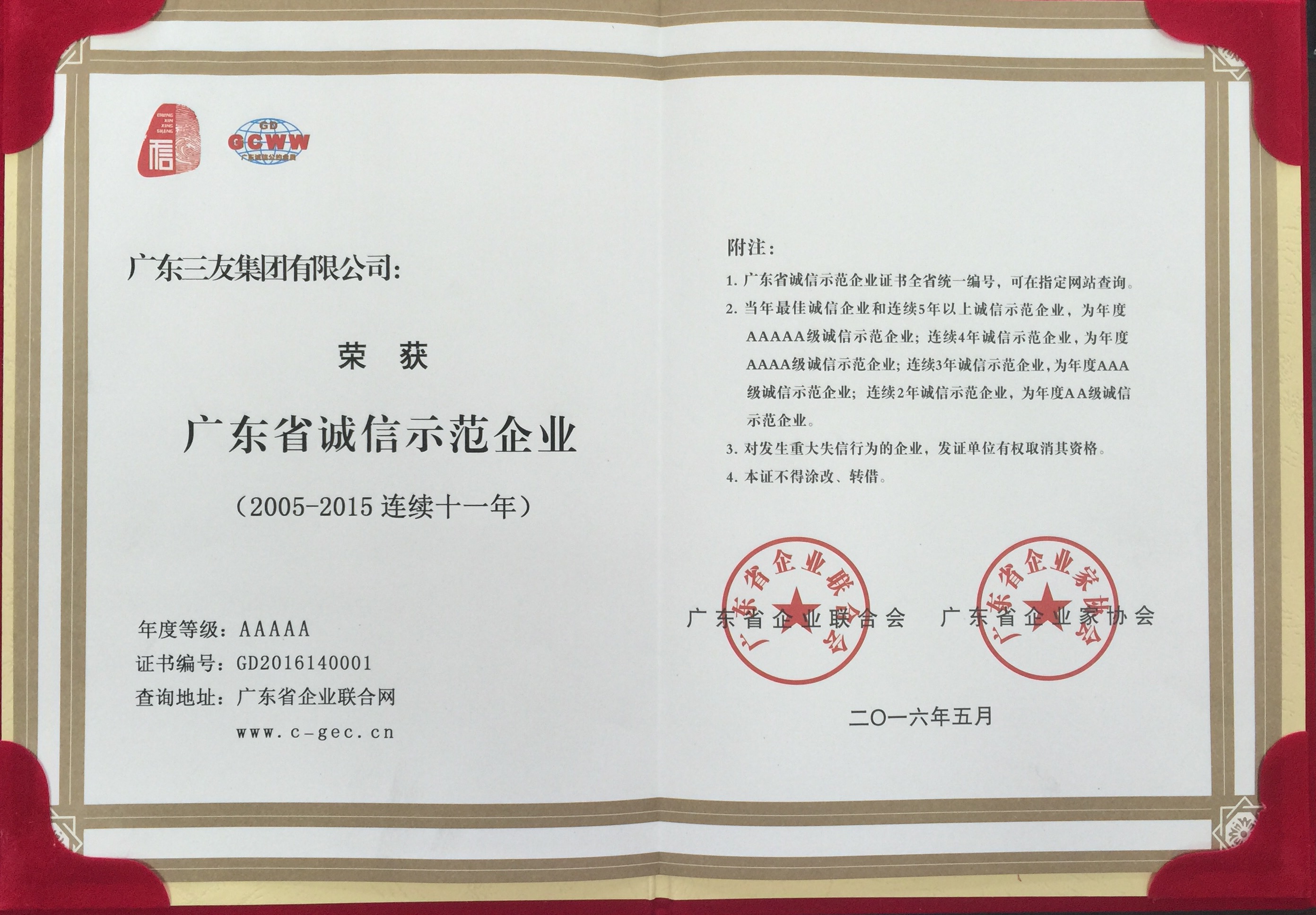 2016年5月,广东省诚信示范企业(连续第十一年)