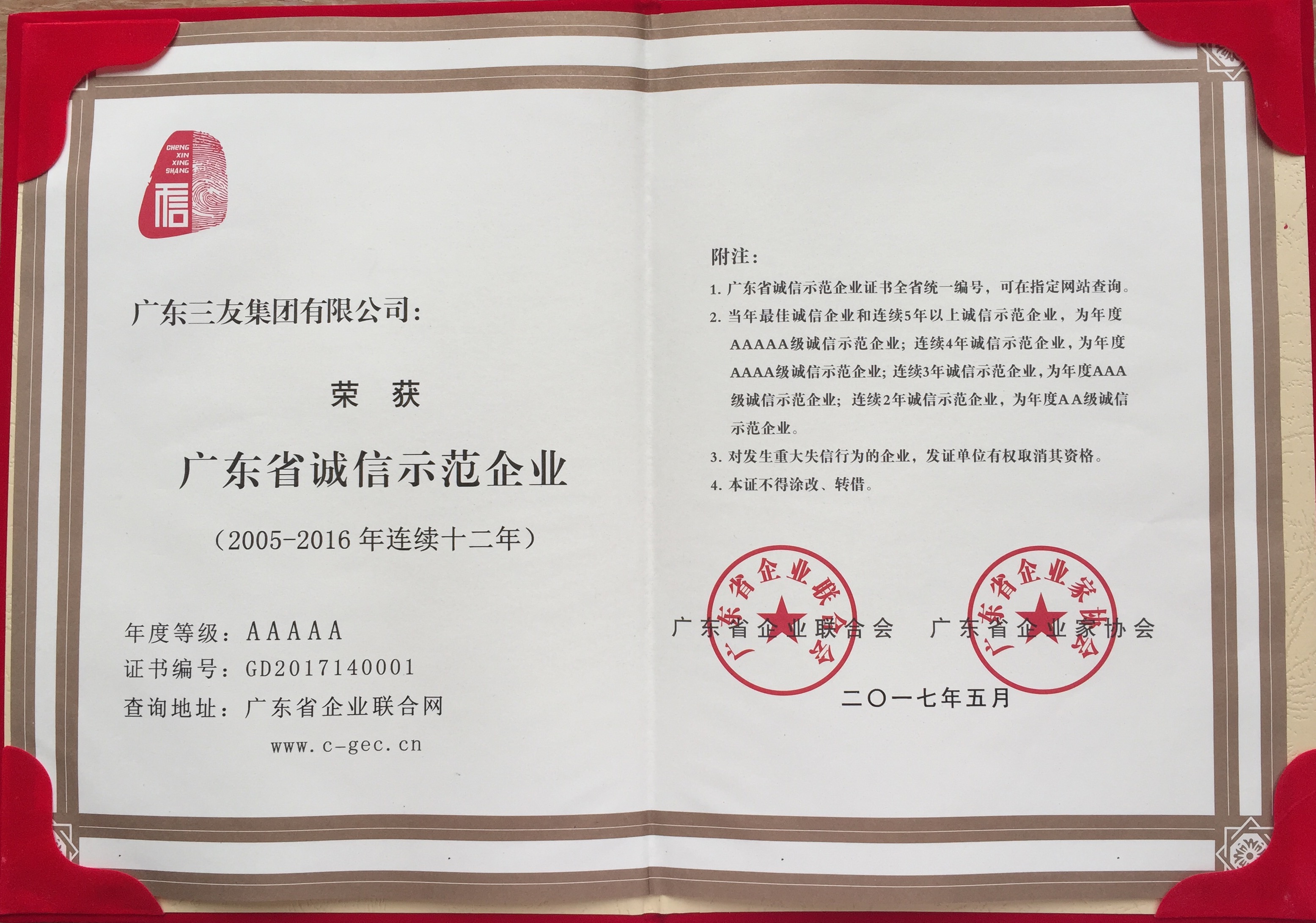 2017年5月,金年会金字招牌诚信集团获“广东省诚信示范企业”称号(连续十二年)