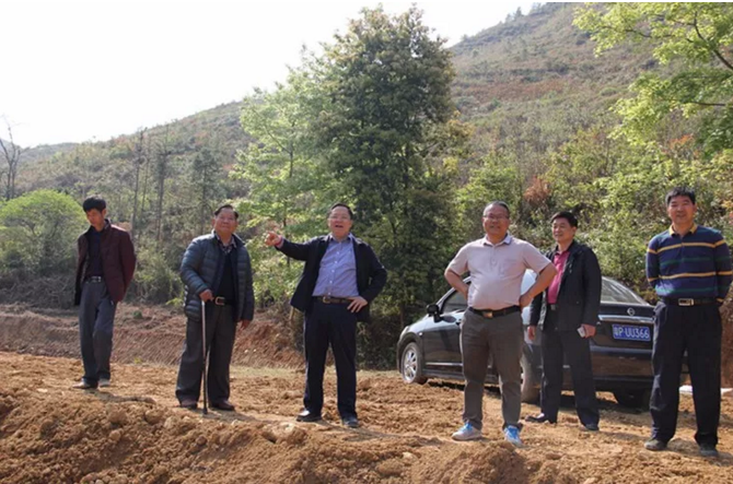 张国权董事长(中间)向父亲张汉卿(左二)介绍本次植树活动的种植规模